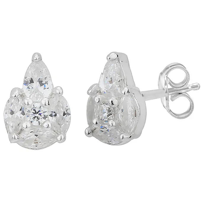 The face of each earrings features 3 marquise shaped White CZs (on the bottom and on either side), a pear shaped CZ at the top and a small round CZ in the centre.